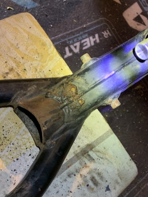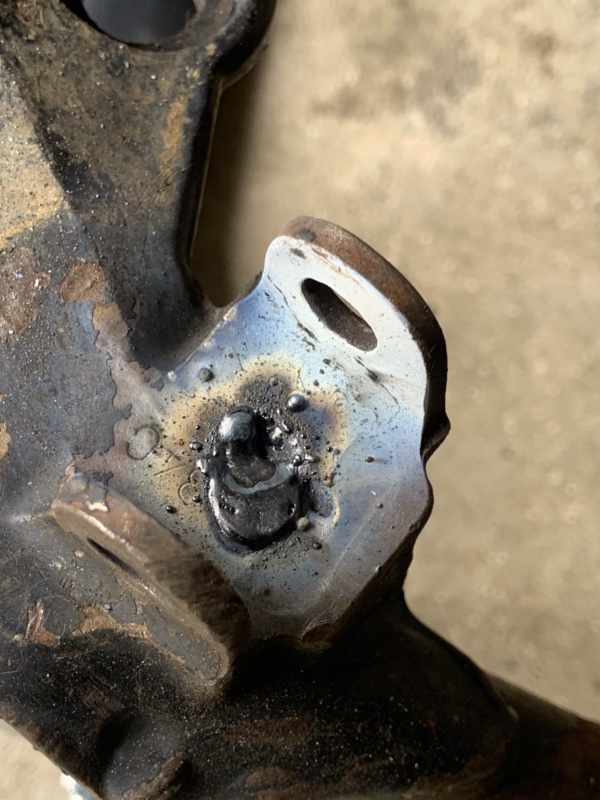 Donc une fois le pépère livré à la maison, c’est parti pour le rebouchage des trous. Ici, rien de bien compliqué, déjà il faut préparer le support. Tu l’as déjà vu sur la photo ci-dessus, j’ai passé un coup de brosse métallique sur perceuse pour mettre à nu le trou du côté droit, je fais de même côté gauche. Ensuite on attaque la soudure.