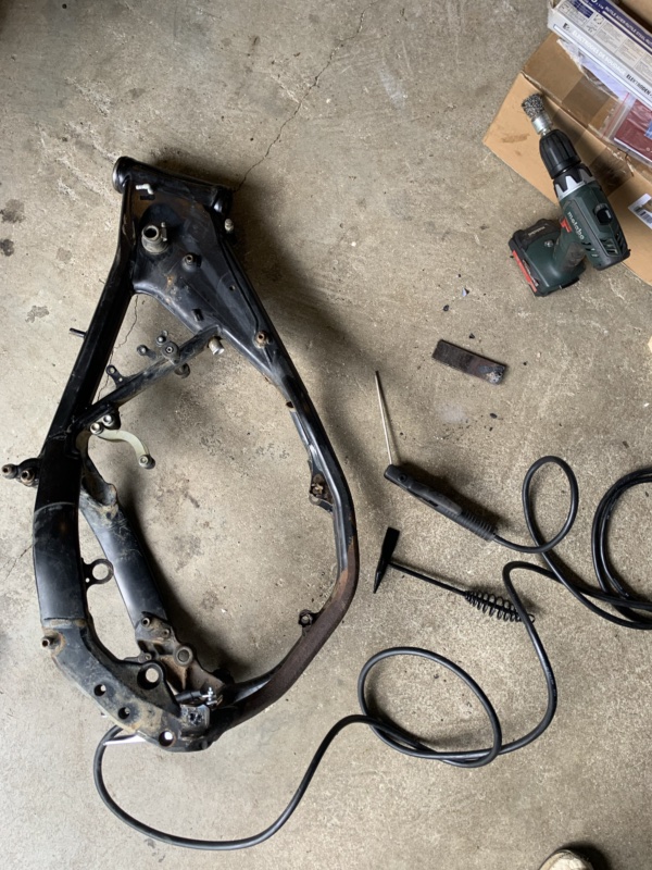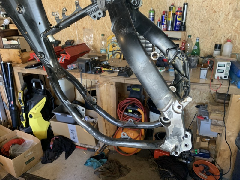 Dans l’attente que ma seconde commande KTM arrive, j’ai de quoi m’occuper maintenant que la moto est toute démontée. Quoi de mieux donc que de commencer par le commencement : le cadre ! Tu l’avais vu sur les photos dès l’achat, le pépère à bien vécu et il y a de la rouille un peu partout, surtout sur la partie inférieure. J’ai aussi remarqué d’autres petits soucis que l’on va corriger par la même occasion.