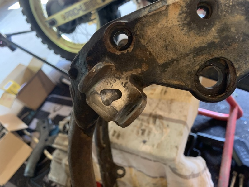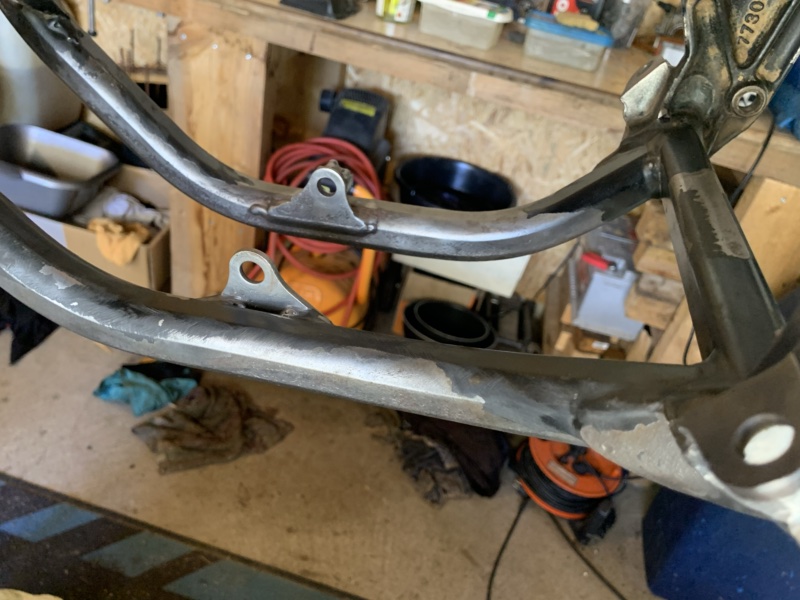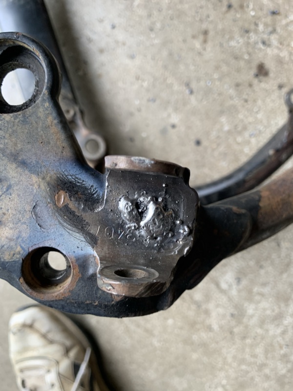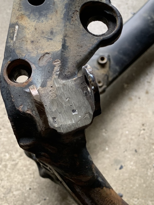 Globalement le cadre est en bon état, j’entends par là qu’hormis les griffures du temps sur la peinture et la rouille, il n’est pas fendu, les pas de vis sont quelque peu rouillés mais pas foirés et donc c’est plutôt pas mal. Par contre j’ai noté en plus de la rouille générale 2 trucs.