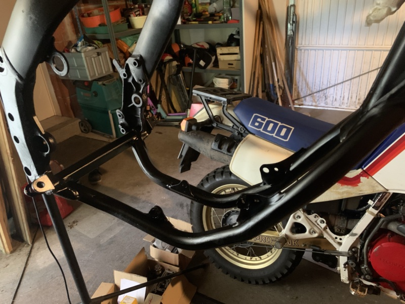 Le cadre étant sanglé sur les madriers du toit du garage, je suis prêt à passer à la peinture. Comme pour la KTM 350, j’y vais à la bombe 2K Direct, j’ai cette fois pris un 9005 Noir foncé MAT, c’est ce qui me semble convenir le mieux pour cet usage.