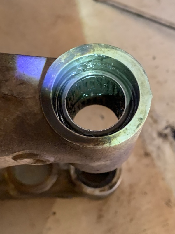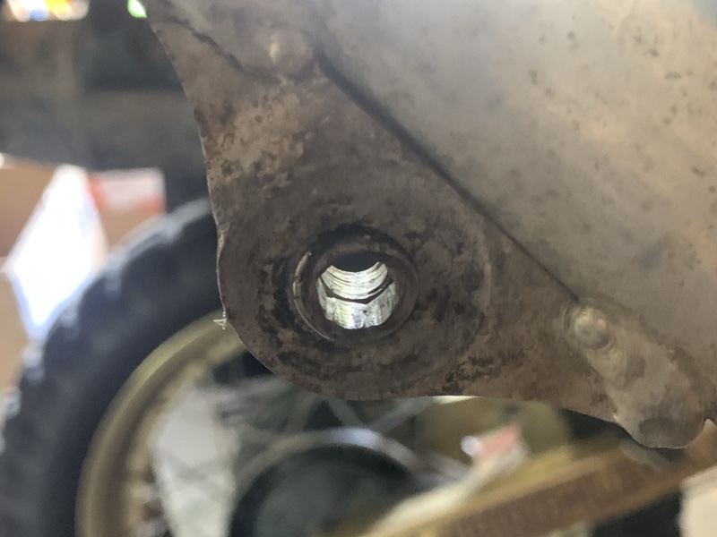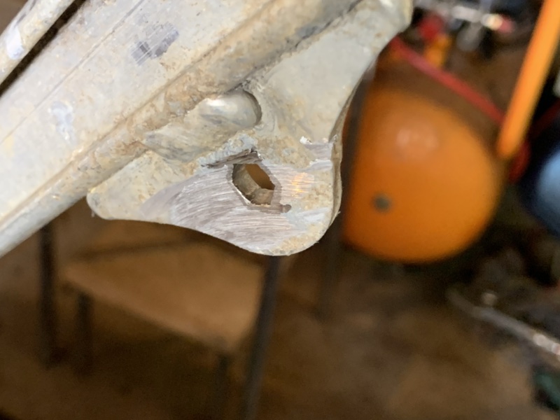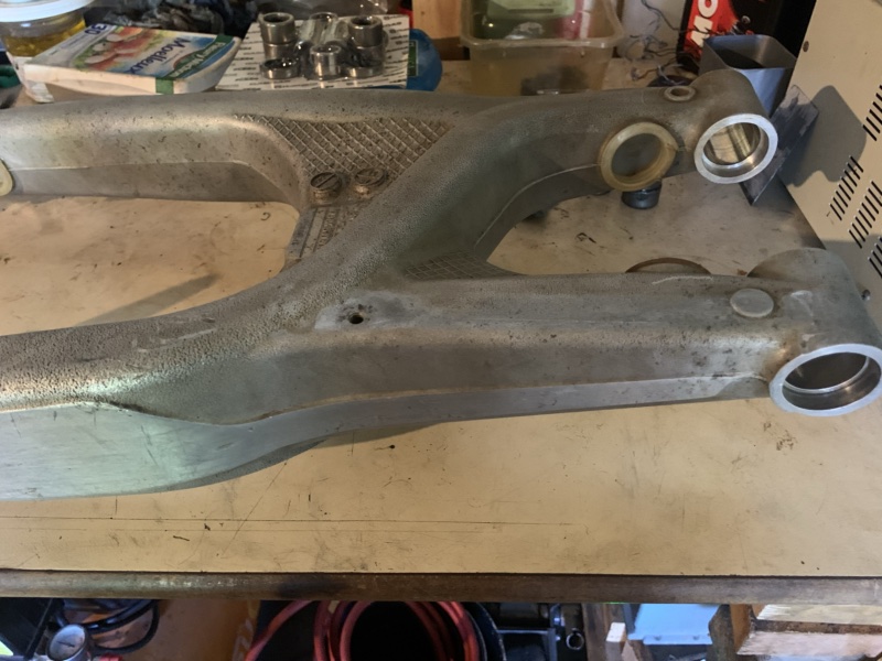 Bon c’est pas le tout, y’a encore du boulot et cette fois c’est sur la boucle arrière en alu. En effet, j’avais remarqué qu’un insert de fixation du silencieux était foiré, je m’en suis donc occupé :