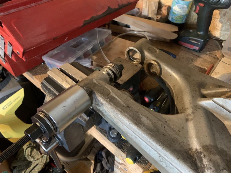 Je peux reposer l’insert neuf que j’avais commandé chez KTM. Pour le coup j’ai bêtement tenté de le poser en vissant, mais l’insert tourne, c’est donc une mauvaise idée. Le principe que j’ai utilisé est différent, j’ai utilisé une longue vis M6 x 1 sur laquelle j’ai positionné une douille des rondelles et un écrou afin de « tirer » l’insert à force que je dévisse l’écrou :