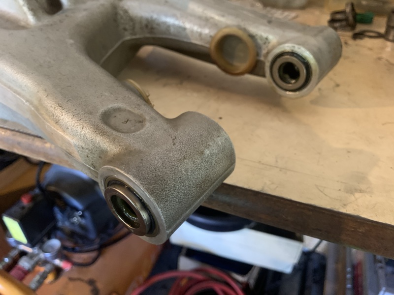 Une fois les roulements extraits et le bras oscillant à nu, un bon coup de moto wash puis de brosse nylon à poil dur + de l’huile de coude pour nettoyer ça au mieux !!