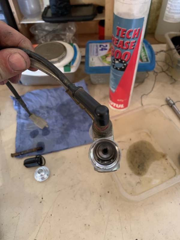 Au passage, j’ai aussi démonté le piston de l’étrier et tout nettoyé (pas de photo), c’était aussi bien sale. Au passage j’ai aussi soufflé la durite, je pense que des résidus étaient dedans. J’avais essayé de souffler à la bouche mais j’avais juste un petit filet d’air. Une fois la soufflette passée, c’était bien mieux !