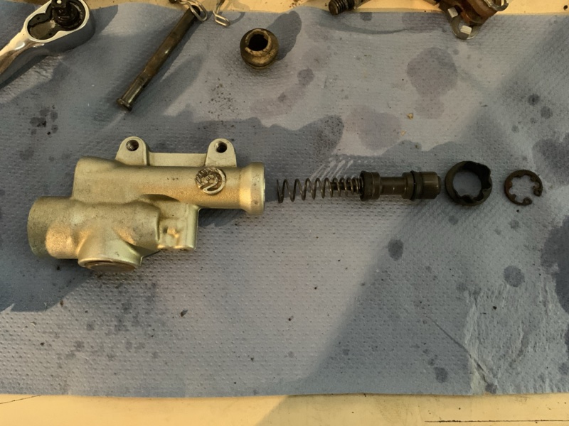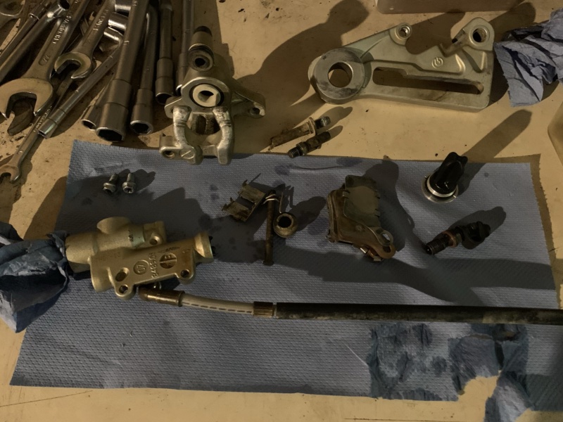 Pourquoi m’en occuper ? Ben quand j’ai démonté, j’avais eu une fuite de liquide et donc je voulais en profiter pour nettoyer / remonter ça propre. C’est donc maintenant qu’on s’y colle (et j’ai eu raison de le faire !!). L’ensemble posé sur l’établi, c’est l’heure de la mise en pièces, que ce soit côté étrier comme maitre cylindre !
